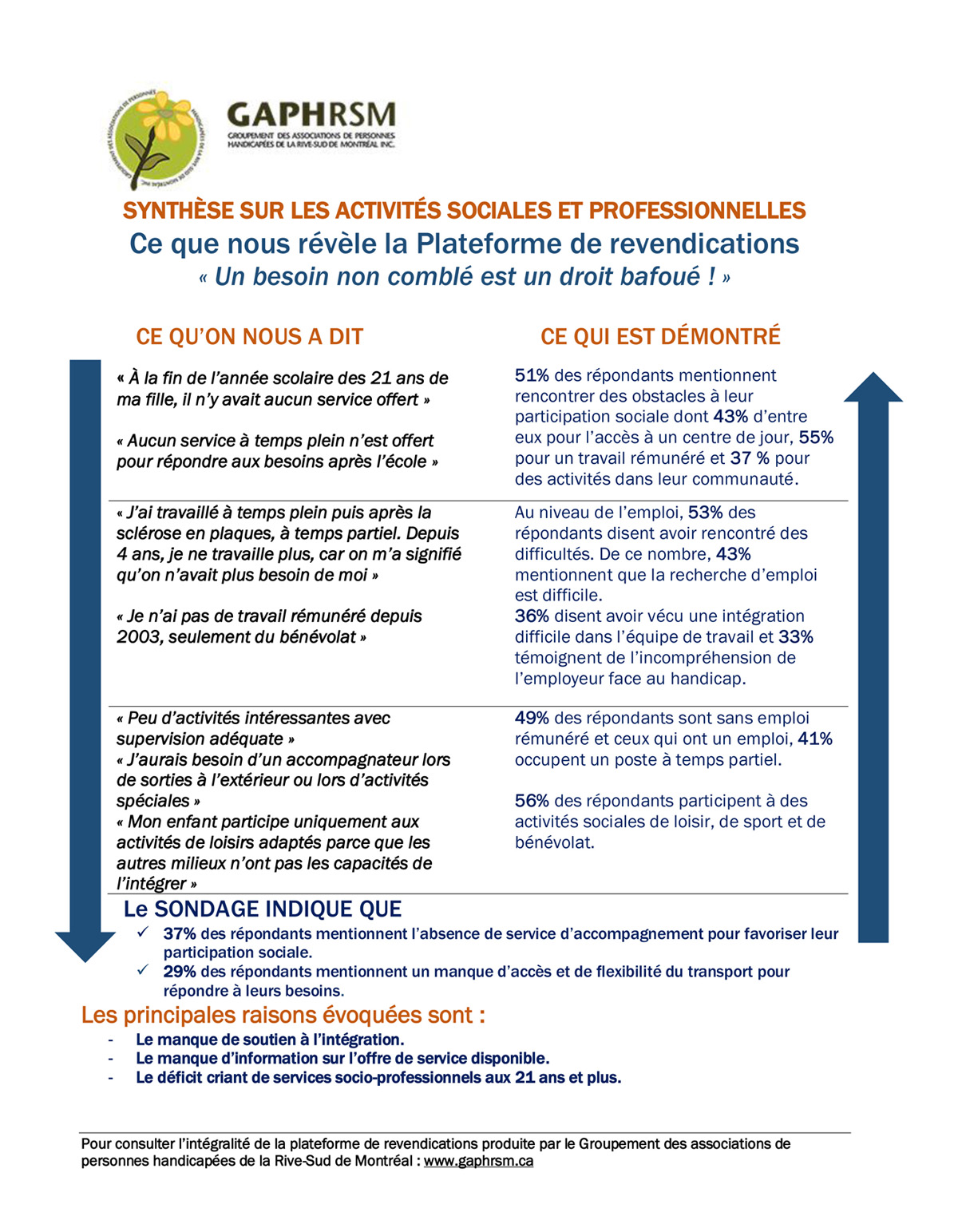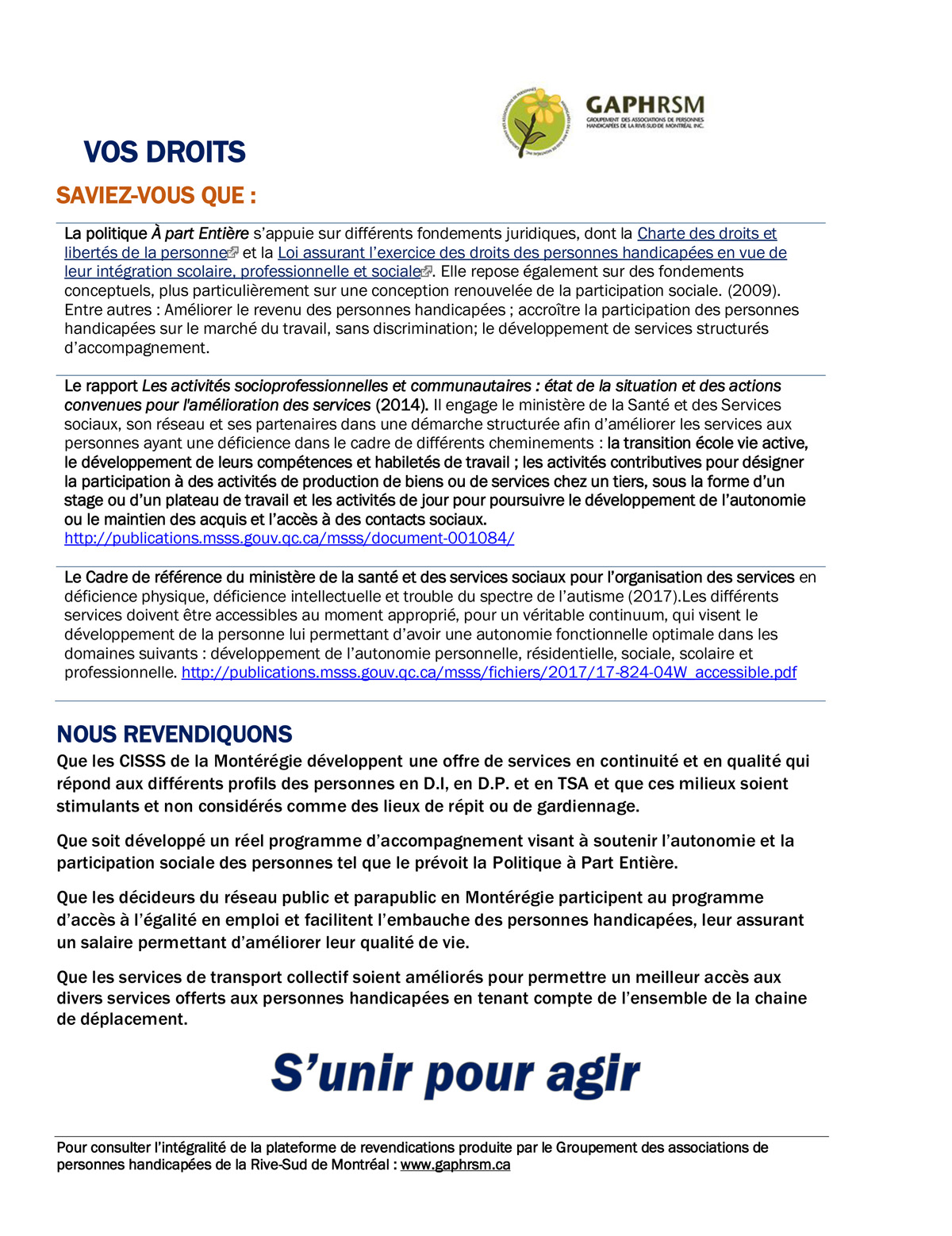 Extrait de la plateforme de revendications produite par le Groupement des associations de personnes handicapées de la Rive-Sud de Montréal. La plateforme intégrale en version accessible est disponible sur le site Web www.gaphrsm.ca